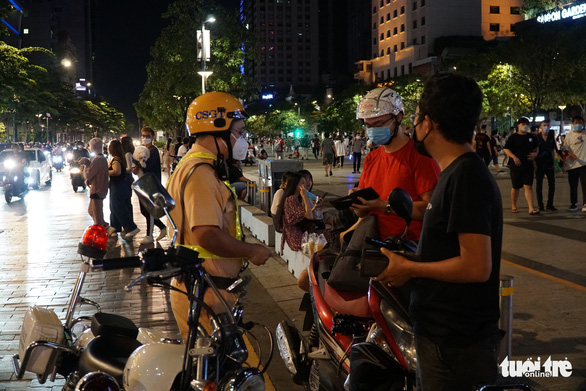 Đến khoảng 19h30, một tổ tuần tra thuộc Đội cảnh sát giao thông – trật tự, Công an quận 1 xuất hiện, lập biên bản hàng chục trường hợp không tuân thủ 5K; đậu xe lấn chiếm lòng đường, vỉa hè.