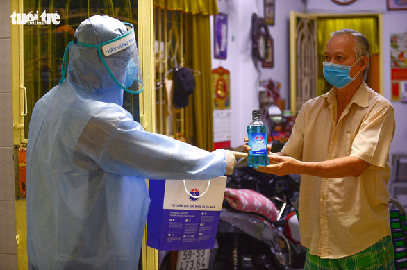 Nhân viên y tế phát túi thuốc, hướng dẫn ca F0 điều trị tại nhà ở TP.HCM – Ảnh: QUANG ĐỊNH