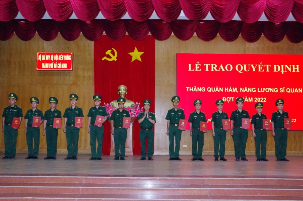 Theo đó, năm 2022 Bộ đội Biên phòng Thành phố Hồ Chí Minh có 33 đồng chí là cán bộ sĩ quan được nâng lương và thăng quân hàm, trong đó nâng lương 6 đông chí; Thiếu tá lên Trung tá 4 đồng chí; Đại úy lên Thiếu tá 8 đồng chí; Thượng úy lên Đại úy có 5 đồng chí; Trung uý lên Thượng uý 6 đồng chí và Thiếu uý lên Trung uý 5 đồng chí.